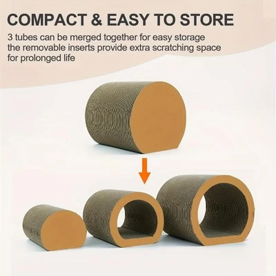 Space-Saving: The three Cardboard Cat Scratchers are nested within each other and can be stored when not in use to save storage space. The convenient design of the cat tunnel bed makes it easy to store when not in use.DIY fun: The three Cat Scratching Bed can be combined at will, both inside and out can be used to sharpen your cat’s claws, the best gift for your cat, very healthy for your lovely cat.Multiple Sizes: This set includes 3 different sizes of cat scratcher beds – small, medium, and large. This allows you to choose the size that best suits your cat’s needs and preferences.3-in-1 Design: Our Cat Tunnel Bed combines a cat tunnel, cat scratcher, and cat bed all in one. The tunnel design provides a fun and stimulating environment for your cat to play and hide, while the scratcher bed allows them to satisfy their natural scratching instincts.Durables Construction: Made from corrugated paper, these cat scratcher beds are Durables and long-lasting. They can withstand even the most enthusiastic scratching and playing, ensuring hours of fun for your cat.