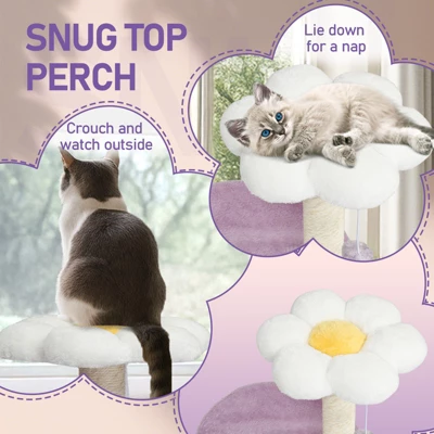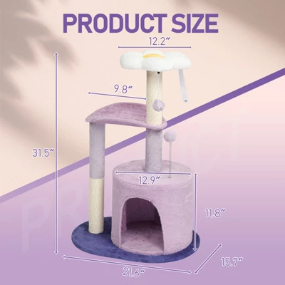 Introductions: Give your feline friend the perfect blend of play, rest, and comfort with this 33in multi-level cat tree. Designed in a charming color palette, this cat tower features a streamlined shape and a variety of resting and play areas, including a cozy enclosed condo, a curved perch that hugs your cat’s body, and a plush top bed with a raised edge. With sisal-wrapped scratching posts and fun toys to entertain your pet, this cat tree is a stylish and functional addition to any home, offering a complete recreation paradise for kittens and small cats. Features: 1. Stylish Multi-Level Playground: This multifunctional cat tower features a streamlined silhouette with multiple platforms, giving your kittens the freedom to climb, leap, or lounge. Whether they’re scratching on the sisal posts or curling up for a nap, this cat tree offers everything they need in one place. 2. Comfortable Resting Areas: Designed for relaxation, the tower includes a plush top perch with a raised rim for a secure view, and a middle curved perch that supports your cat’s natural sleeping posture. The enclosed condo provides a cozy private hideout for peaceful naps. 3. Interactive and Healthy Play: With a spring-mounted plush pom-pom and an upper dangling ball, this tower keeps your cat engaged and active. The sisal-covered posts encourage healthy scratching habits while satisfying your cat’s natural instincts. 4. Sturdy and Pet-Safe Construction: Built with stability in mind, the solid structure supports active play and climbing. Covered in soft plush fabric and made with pet-safe materials, it ensures a safe and gentle environment for your cat. 5. Quick Assembly: Set up is simple with included hardware and a step-by-step instruction guide. In just a short time, your cat will be exploring and enjoying their new favorite place. Specifications: 1. Overall Dimensions: (21.7 x 16.1 x 33.1) in / (55 x 41 x 84) cm 2. Flower Perch Diameter: (12.6 x 12.6) in / (32 x 32) cm 3. Condo Size: (13 x 13 x 12.2) in / (33 x 33 x 31) cm 4. Post Diameter: 2.8 in / 7 cm 5. Net Weight: 11.5 lbs / 5.2 kg Package Includes: 1 x Cat Tree