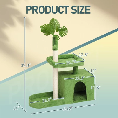 Introductions: Give your feline friend a cozy and stimulating environment with this 36in Cat Tree featuring a unique leafy design. Perfect for small spaces, this cat tower offers a natural touch to your home dcor while fulfilling all your cat’s play, rest, and scratching needs. With padded resting spots, a private condo, sisal scratching post, and a dangling ball toy, your cat will stay active and entertained throughout the day. Built with soft plush and sturdy materials, this compact and modern cat tower is ideal for kittens and small indoor cats. Features: 1. Tropical-Inspired Design: This cat tree features leafy accents that bring a fun jungle vibe into your space, making it a stylish and functional addition to any room. 2. Scratch Climb Friendly: Equipped with sisal-wrapped posts that satisfy your cat’s natural urge to scratch, climb, and stretch, helping protect your furniture from damage. 3. Multiple Resting Spots: Includes a soft padded top perch, a spacious cat condo for hiding, and a bottom padded nookperfect for lounging and catnaps. 4. Soft, Safe Durable: Made with high-quality particle board and covered in ultra-soft plush fabric to provide a cozy, skin-friendly experience for your pets. 5. Easy to Assemble: Comes with complete hardware and clear instructions for a quick, hassle-free setup. Specifications: 1. Overall Dimensions: (31.1 x 11 x 36.2) in / (79 x 28 x 92) cm 2. First-Level Condo: (15.4 x 11 x 12.6) in / (39 x 28 x 32) cm 3. Side Bed: (15.4 x 10.6 x 3.1) in / (39 x 27 x 8) cm 4. Second-Level Platform: (15.4 x 12.6 x 2.4) in / (39 x 32 x 6) cm 5. Second-Level Height from Ground: 20.5 in / 52 cm 6. Tube Diameter: 2.8 in / 7 cm 7. Net Weight: 9.8 lb / 4.45 kg Package Includes: 1 x Cat Tree