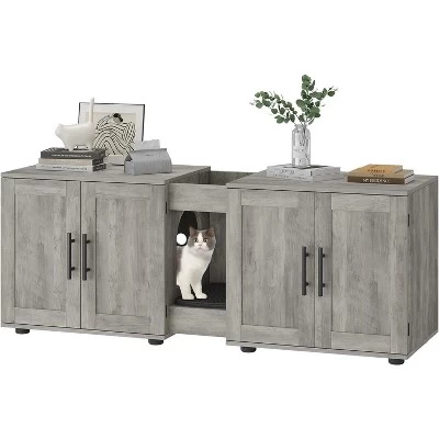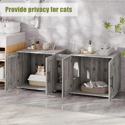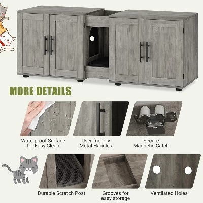 Specifications:Material: MDF + PBOverall Size: 55 x 17.7 x 20.6 InchRoom Size: 22.7 x 17 x 19.7 InchCentral Groove Width: 7.9 InchLeg Height: 1.9 InchMax. Static Load Capacity of the Top : 125 LbsMax. Static Load Capacity of the Bottom: 125 LbsPacking List:1 x Cat Litter Box Enclosure1 x Hardware Pack1 x Instruction Manual
