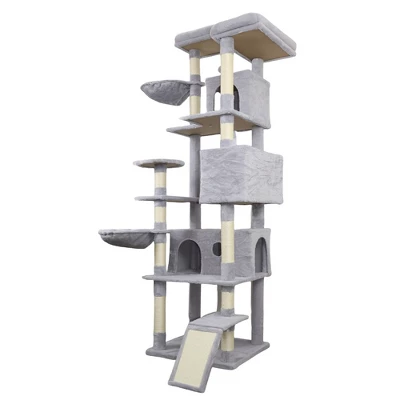 Sturdy and Stable: The cat tower is supported by sturdy posts, sturdy and stable; enlarged baseboard to avoid wobbling or tipping over, strengthened with battens to ensure overall stability; anti-toppling fittings ensure double safety. Sisal-covered Scratching Posts : The bottom risers are fitted with cat hair brushes, multiple reinforced scratching posts with natural sisal ropes is perfect for your cats to scratch and grind their claws, no scratching your furniture anymore! Comfy Home For Entertaining: 3 roomy condos offer luxurious napping experience; 2 plush perches with raised edge allow more safety for cats to enjoy the feeling of the top of the world while resting; 1 interactive jingly balls to play with, several layers layout for climbing up and down. Easy Assemble: The cat furniture equipped with all the hardware, tools and detailed instructions for quick and easy installation. Overall Size: 19.7*19.7*68.9 inch. Suitable for 3-4 cats of different ages to climb and play.