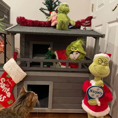 - 2-story cat house provide spacious activity space.A raised bottom with plastic feet to keep the cat Shelter dry from the water or dirt.