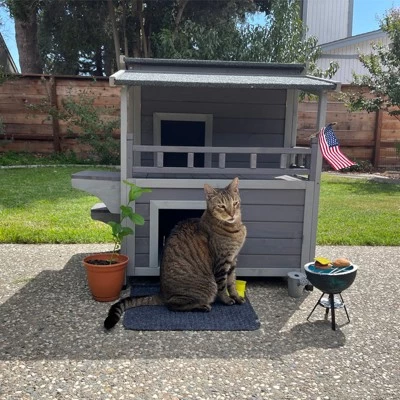 - Large outdoor cat condo with 2 front doors and 2 jump platforms provides fun entrances for cats.