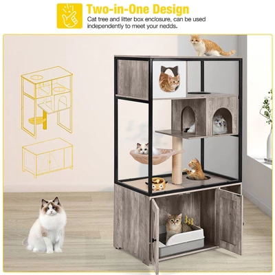 - 3-Story Cat House: Yes, a true, big house. Coming with 2 cat caves, a scratching post, a cozy hammocks, and a cat litter box enclosure—now, your cat can observe, relax, play, eat, and answer nature’s call…All in one place.
