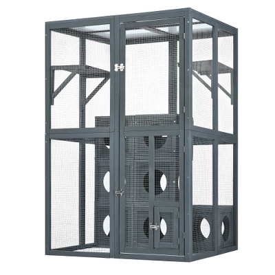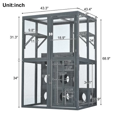 This outdoor cat house measures 43.3 inches long x 43.4 inches wide x 68.9 inches high, providing a spacious multi-level play area. The main door, measuring up to 69 inches in height, allows easy access for interacting with your cat, feeding, and cleaning, while the corner cat-sized door provides a safe entrance for your feline friend. Its compact footprint makes it ideal for placement in a backyard, garden, or patio, creating a private outdoor paradise for your cat.