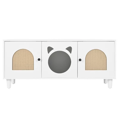 DESIGN: Furniture style Cream white cabinet cat litter house with scrathing doorA modern style 3-in-1 design sturdy shelter for pet.And Multi functional furniture form can be used as both a litter box and a cat bed, storage cabinet, or side table, saving space while enhancing home style.