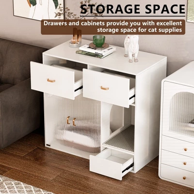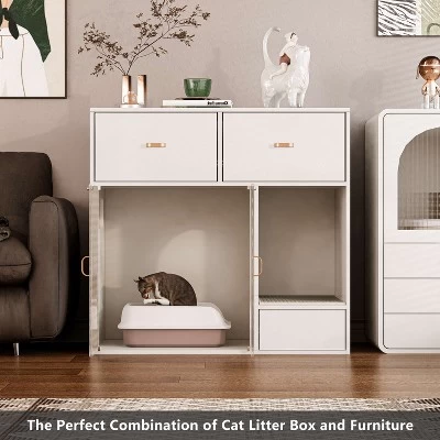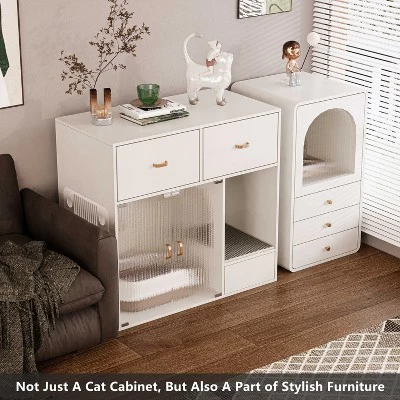 - Under the cat cabinet is a passage for cats to enter and exit freely, a space for placing the litter box, and a storage drawer. The 2 storage drawers above can store cat supplies such as canned food, snacks and toys. Due to the sturdy structure and good load-bearing capacity of the desktop, you can store some cat litter on it, or place some decorative ornaments.