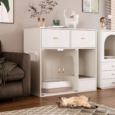 - The modern style cat cabinet can be easily integrated into your living room, bathroom, hallway, etc. The stylish appearance allows you to use it as a side storage cabinet, which is a good choice to place around the sofa or next to the cabinet. A cat litter box enclosure can help you hide your cat’s litter box and control the smell of your cat’s poop. This specification of cat cabinet is recommended for households with 1-2 cats.