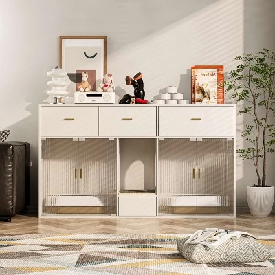 - The lower part of the cat cabinet is equipped with storage drawers and a passage for cats to enter and exit freely. There is a space for a litter box on each side. Three storage drawers on the top can store cat supplies, such as canned food, snacks, toys, etc. Because the tabletop structure is sturdy and has good load-bearing capacity, you can store some cat litter on it, or place some decorative ornaments.