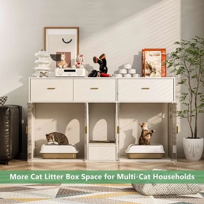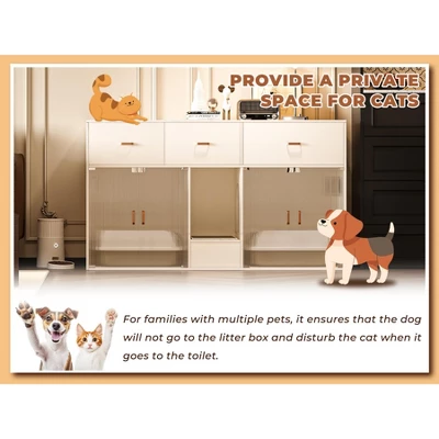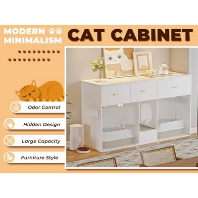 - The modern style cat cabinet can be easily integrated into your living room, bathroom, hallway, etc. The stylish appearance allows you to use it as a side storage cabinet, which is a good choice to place around the sofa or next to the cabinet. A cat litter box enclosure can help you hide your cat’s litter box and control the smell of your cat’s poop. This specification of cat cabinet is recommended for households with 2-4 cats.