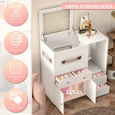 - This unique cat cabinet is specially designed with an upper space to place the cat litter box, so you don’t have to squat or kneel for a long time to clean the cat litter. The 40.2” cat cabinet height fits the human body’s operating height requirements. Just stand and open the top glass cover to quickly clean the cat litter.