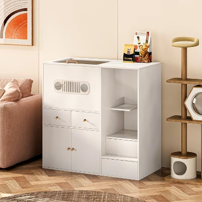 - The lower part of the cat cabinet has 2 storage drawers and 1 large storage cabinet, which can be used to store cat supplies such as canned food, snacks, toys, heavy cat litter, etc. Due to the sturdy structure of the desktop and good load-bearing capacity, some additional cat items and decorative ornaments can be stored on it.