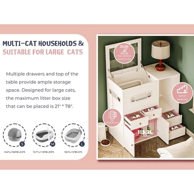 - The modern style cat cabinet can be easily integrated into your living room, bathroom, hallway, etc. The stylish appearance allows you to use it as a side storage cabinet, which is a good choice to place around the sofa or next to the cabinet. The cat litter box enclosure can help you hide the cat litter box and control the smell of cat poop. This specification of cat cabinet is recommended for families with 1-2 cats.
