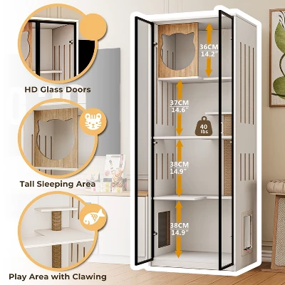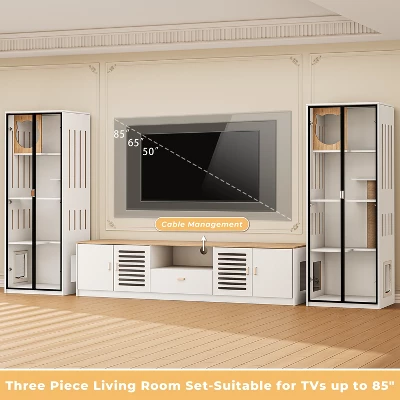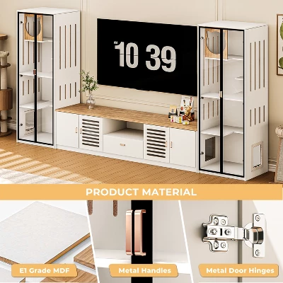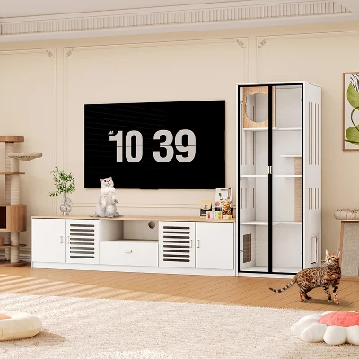 Such an entertainment center set includes a TV stand and a glass display cabinet, which integrates the concept of harmonious coexistence between people and pets into furniture design. It is not only a media console, but also a glass cat house and cat litter box enclosure. Imagine that you can see your cat playing in the glass cabinet while watching TV, and enjoy the fun of seeing the cat at any time! The 78.7” TV cabinet is suitable for TVs up to 85 inches. The cat litter box is placed in the cabinet of the TV stand to control odors well. The glass cabinet is used for daily activities such as feeding, jumping, sleeping, scratching, etc. You can control whether the cat is allowed to enter and exit freely by setting the button of the pet door. You will share the living room and furniture with your furry children!