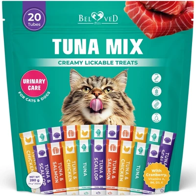 Our Creamy Lickable Cat Treats – Tuna & Chicken Mix are smooth, squeezable snacks made with real tuna, and delicious seafood flavors like salmon, crab, shrimp, and scallop. Packed in a bulk value pack of 40 sticks, these puree-style treats provide hydration, low-calorie nutrition, and added support from cranberry for urinary wellness. Perfect for interactive hand-feeding, rewarding, or mixing into meals, they’re grain-free, gluten-free, soy-free, non-GMO, and contain no artificial additives—making them a clean, fun, and irresistible way to bond with your cats and small dogs.