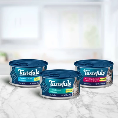 - Contains one (1) Variety Pack of BLUE Tastefuls Natural Flaked Wet Cat Food, Tuna, Chicken, Fish & Shrimp Entrées in Gravy 3-oz cans (12 count – 4 of each flavor)