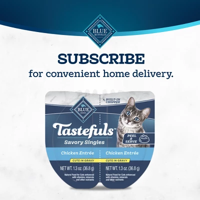 - Contains: One (1) 2.6-oz. Twin Pack of Blue Buffalo Tastefuls Savory Singles Adult Cuts in Gravy Wet Cat Food, Chicken Entrée