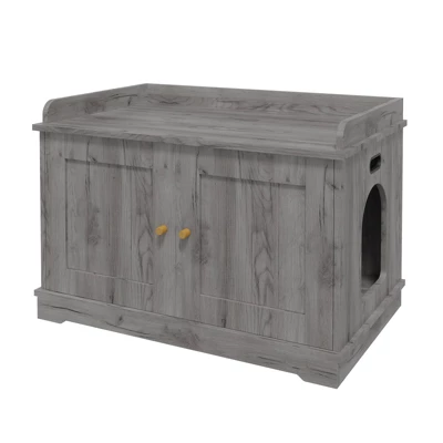 Product DescriptionFeaturing a charming wooden barn door, this unit blends rustic elegance with daily convenience. Easy to access and clean, it adds a cozy, homey touch to any interior.Space-saving and stylish, this enclosure doubles as a functional end table. Place lamps, books, or plants on top while your cat enjoys their own hidden retreat below.