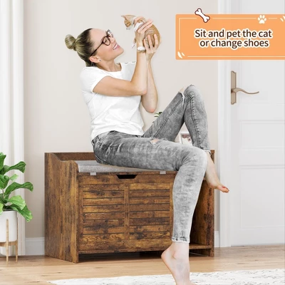Keep your home tidy and stylish with this wooden cat litter box enclosure featuring a convenient top-opening design. The top-entry structure makes scooping and cleaning effortless while reducing the need to bend over, promoting ergonomic maintenance. Designed to blend seamlessly into your decor, this hidden litter box cabinet doubles as functional storage furniture, providing your cat with a private and comfortable toilet space. The included soft cushion serves dual purposes¡ªit offers a cozy resting spot for your cat and a handy temporary seat or shoe-changing pad for people, maximizing utility. Spacious and secure, the enclosure measures 33.8″ L x 19.6″ D x 24.2″ H externally, with an internal compartment size of 23.2″ L x 19.2″ W x 16.5″ H, accommodating litter boxes up to 18″ x 22″ x 15″. Assembly is quick and simple with included tools and clear instructions. This versatile piece fits perfectly as a farmhouse-style accent or a practical cat litter cabinet in any room. Dimensions: External: 33.8″ L x 19.6″ D x 24.2″ H Internal Compartment: 23.2″ L x 19.2″ W x 16.5″ H Max Litter Box Size: 18″ x 22″ x 15″ Material: Durable wood construction with soft cushioned pad What You Get: One wooden cat litter box enclosure with top entry and cushion Assembly tools and instructions After-Sales Service: Customer support available for assembly assistance and product inquiries