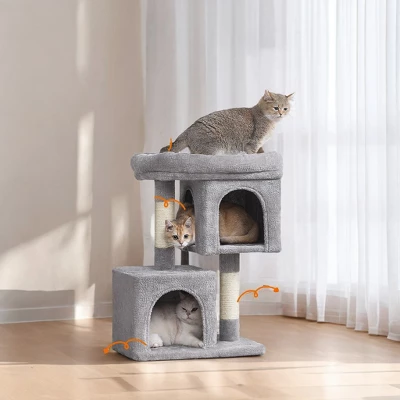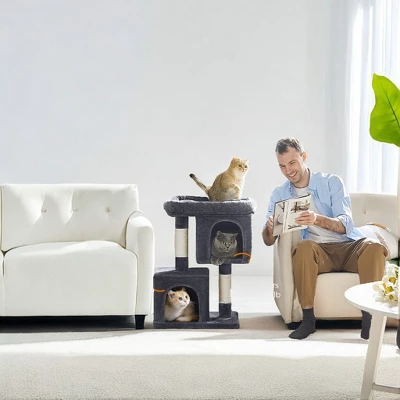 This 29.1 – inch cat tower is a perfect haven for medium cats weighing up to 11 lb. It offers a large cat perch where your cat can relax and observe its surroundings, providing a sense of security and dominance. The two cat caves are designed to give your cat private and cozy spaces to retreat to when they want to nap or simply unwind. These caves mimic natural hiding places, making your cat feel safe and comfortable.The built – in scratching post is an essential feature that satisfies your cat’s natural instinct to scratch. It helps keep their claws healthy and sharp while protecting your furniture from scratches. The cat tower is designed with the needs of medium cats in mind, providing them with a fun and functional space to play, rest and explore in the comfort of your home.Material: Particleboard, Plush, Sisal Product Size: 19.3″L x 12.6″W x 29.1″H (49 x 32 x 74 cm) Product Weight: 15.2 lb (6.9 kg)