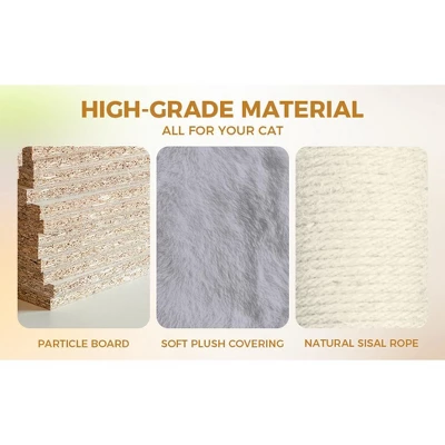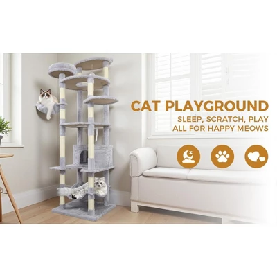 Sturdy and Stable: The cat tower is supported by sturdy posts, sturdy and stable; enlarged baseboard to avoid wobbling or tipping over, strengthened with battens to ensure overall stability; anti-toppling fittings ensure double safety. Sisal-covered Scratching Posts : The bottom risers are fitted with cat hair brushes, multiple reinforced scratching posts with natural sisal ropes is perfect for your cats to scratch and grind their claws, no scratching your furniture anymore! Comfy Home For Entertaining: 3 roomy condos offer luxurious napping experience; 2 plush perches with raised edge allow more safety for cats to enjoy the feeling of the top of the world while resting; 1 interactive jingly balls to play with, several layers layout for climbing up and down. Easy Assemble: The cat furniture equipped with all the hardware, tools and detailed instructions for quick and easy installation. Overall Size: 19.7*19.7*68.9 inch. Suitable for 3-4 cats of different ages to climb and play.