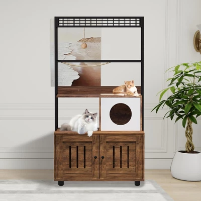 60” Hidden Litter Box Furniture with Metal Frame Wood Cat Tower Cabinet with Litter Box Enclosure, Condo, Hammock and Scratching Mat Dog Proof Litter Box Enclosure