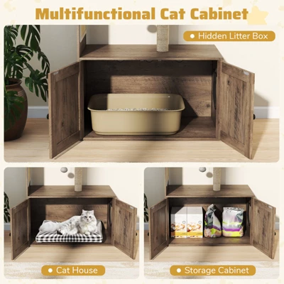 Combines a stylish cat tree, hidden litter box, and storage cabinet in one unit
