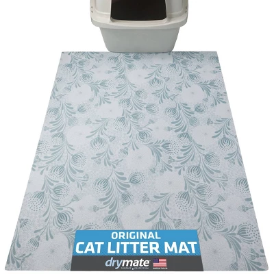 Reduce litter tracking in your home with our Light Blue Floral Design Litter Trapping Mat from Drymate®. The soft material gently separates cats’ paws when they land on it, causing litter to be released from their paws. Litter attaches to the top fiber, reducing tracking throughout your home. Not only does the Drymate® Litter Trapping Mat reduce litter tracking it also makes cleanup around the litter box simple and easy. Gently shake the mat over the litter box to release the trapped litter, and machine wash as needed. For best results machine wash warm separately or hand wash. Hang to dry. Cat with sensitive paws? No worries! The soft fibers of the Drymate® Litter Mat are gentle on cats’ paws. Featuring the same waterproof backing as our original Litter Mat; floors are protected from litter box misses and accidents. The product is made with 37% post consumer recycled plastic.