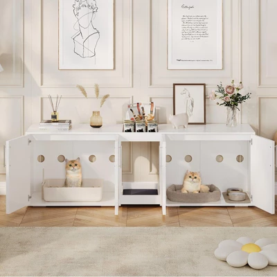 Highlights at a glance:Spaciously designed for two cats with the option to separate into two individual litter boxes for added flexibility.Thick engineered wood for stability and durability, ensuring no wobbling during use.A side door for easy access, providing a safe and enclosed environment for your cats.Four vent holes for optimal air circulation, effectively reducing odors.Smooth, waterproof surface allows for effortless cleaning, keeping the area fresh and hygienic.A removable soft cushion provide an additional leisure area.Open storage shelf for litter scoops and toys, keeping everything organized and accessible.