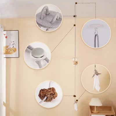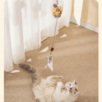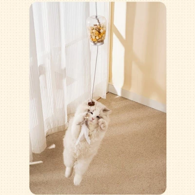Turn mealtime into playtime with the Fairyland™ Hanging Cat Treat Dispenser Toy. This clever design combines a transparent treat container with a dangling feather teaser, encouraging cats to bat, paw, and play while releasing treats.Made from durable PVC with a strong nylon rope, it’s safe, non-toxic, and built to last. The adjustable hanging cord makes it easy to install on ceilings, doors, or walls, while the elastic food release mechanism provides an exciting challenge for curious cats.With natural matatabi wood and feather accents, this toy appeals to cats’ instincts and promotes healthy activity. Perfect for indoor cats who need extra stimulation, this treat dispenser doubles as a fun puzzle feeder and stylish home accessory.
