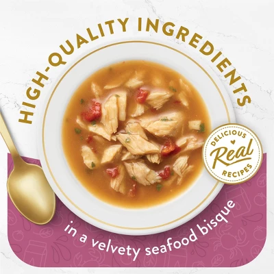 Elevate your cat’s dining experience with Purina Fancy Feast Broths Seafood Bisque and Accents of Real Crab wet cat food complements. Each easy-to-open pouch of our mouthwatering broth cat food complement contains a delicate seafood bisque made with accents of real crab for an easy way to add an extra touch of gourmet to any meal. Made with no artificial flavors, colors or preservatives, our handcrafted broths provide a delectable grain free cat food topper that cats adore. Watch your favorite feline purr with love and excitement ready to lap up every last bite when you pour a Fancy Feast Broths cat food complement pouch over her dish. Containing the most elevated ingredients Fancy Feast has to offer, this limited ingredient cat food mixer is a recipe you can both appreciate. Show your beloved companion the finer things in life when you complement her dish with these high-quality, delicious Fancy Feast seafood cat food toppers.