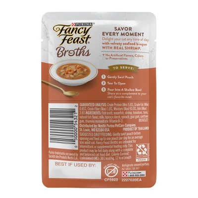 Prompt purrs of delight when you offer your cat a Purina Fancy Feast Broths Seafood Bisque With Shrimp gourmet cat complement. A delightful accompaniment to her regular food, this broth cat food complement is thoughtfully made with attention to every detail to please the discriminating taste buds of refined felines. Featuring hand-crafted ingredients, this decadent broth goes beyond the ordinary. We include the most elevated ingredients Fancy Feast has to offer with real shrimp for the gourmet seafood flavor cats dream about. Tender bites with real seafood offer ingredients cats can see for a unique sensory experience. Because we don’t add artificial flavors, colors or preservatives to this limited ingredient cat food broth, each lick satisfies your cat’s high expectations while meeting your ingredient preferences. Make the moments you share with your cat even more delightful when you serve this pouch alongside her favorite seafood cat food.