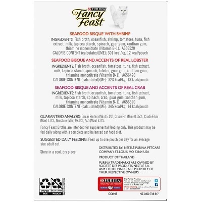 Delight your cat with a Purina Fancy Feast Broths Seafood Bisque Collection adult cat food complement variety pack. Featuring three grain free wet cat food toppers to offer your cat lickable, lovable gourmet cat food to enhance their mealtime experience. We make our Broths recipes with quality and care in the smallest details, using the most elevated, hand-picked ingredients Fancy Feast has to offer, without artificial flavors, colors or preservatives. Enhance your cats meals with a Purina Fancy Feast Broths Seafood Bisque Collection lickable adult cat food complement variety pack.