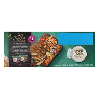 - Purina Fancy Feast cat food variety pack featuring real beef or pork and delivering 100 percent complete and balanced nutrition for adult cats