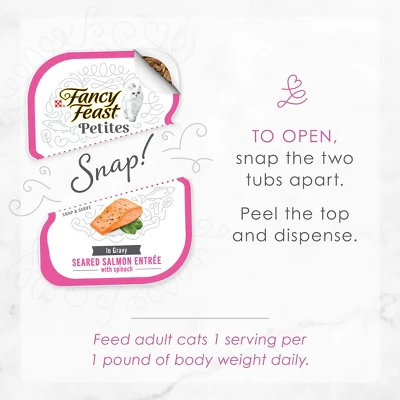 Show your fancy feline how much she’s loved with the irresistible flavor of Purina Fancy Feast Petites Seared Salmon Entree With Spinach in Gravy gourmet wet cat food. Made by Fancy Feast, the number 1 cat food brand (as of April 2025 sales), each pate with gravy tray breaks apart into two perfectly sized containers that snap apart into fuss-free tubs to deliver just the right amount of cat wet food. Each serving of Fancy Feast salmon cat food is made fresh with real salmon and has no artificial preservatives or colors. Serve a gourmet dish of Purina Fancy Feast Petites wet cat food pate and delight your furry connoisseur’s senses with the purr-worthy flavor she’s been waiting for.