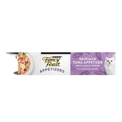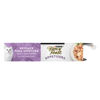 Add delicious flavor to your cat’s diet when you introduce them to Purina Fancy Feast Appetizers Skipjack Tuna with a Sole Grain Free Cat Food Toppers. Featuring real ingredients you can trust and a delicious wet cat food fish taste with a tender texture, these appetizers can be given as adult cat food toppers or as tasty lickable between-meal treats. With high-quality proteins in a broth cats can’t resist, this Purina Fancy Feast Appetizers Steamed Skipjack Tuna with a Sole Grain Free Cat Food Topper is the perfect addition to your cat’s complete and balanced diet.