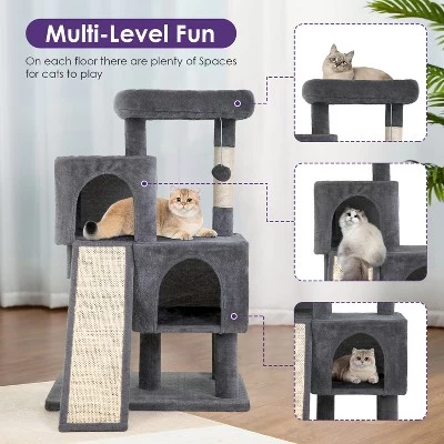 - [Protect your furniture] Multi-level suit the inclination of your feline to climb. At the base of the cat tree is a scratching ramp that doubles as a cat scratching toy and ladder. The front doors of the cat condos provide simple access, and a hanging ball toy at the top can be used to assist stretch, exercise, and improve the cat’s balance and agility. They also prevent scratches on your expensive furniture.
