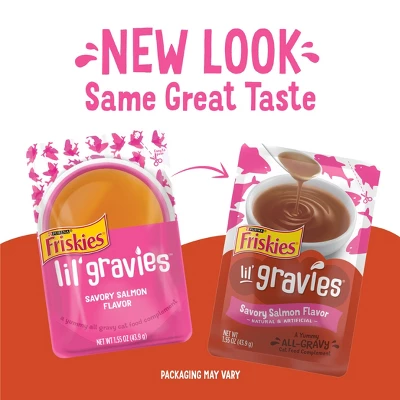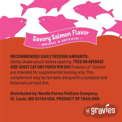 Welcome your kitty into a gravy purr-a-dise with Friskies Lil’ Gravies Savory Salmon Flavor Cat Food Complement. Made with yummy salmon flavor, each pouch of gravy-delicious goodness can be used as a topper for dry food or as a treat between meals. The savory recipe adds the thrill that your cat craves. And when you pair it with a crunchy dry cat food, she will enjoy the variety of texture and tastes down to the last bite. Each appetizing experience is packaged in a single-serving pouch, making it easy to shake, tear and pour your way to a scrumptious treat for your darling cat. We bet your feline friend can never get enough gravy in her bowl. So we made sure that each serving offers added moisture and whisker-licking flavor. Friskies knows that surprising your cat with a delightful treat is one of the highlights of the day you share with your cherished furry friend. That’s why we’re passionate about coming up with tasty combinations for you and your best feline friend to discover.