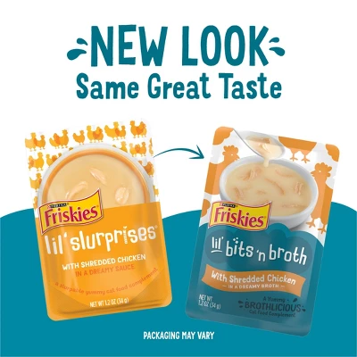 Wow your cat at mealtime by topping her regular wet or dry cat food with a Purina Friskies Lil’ Slurprises With Shredded Chicken in a Dreamy Sauce cat food complement. Watch your lil’ fur ball slurp up the deliciously dreamy sauce and happily nibble the tender lil’ bits with real shredded chicken that indulge her love of poultry. Our Friskies poultry cat food complements are perfectly sized to make yummy anytime treats for cats, and the delectable sauce keeps her taste buds engaged. We make Lil’ Slurprises with no artificial preservatives and package each serving of cat food toppers in a convenient pouch. Go ahead and pour the whole cat food complement pouch over her favorite wet food or kibble, or serve this recipe with real chicken as a between-meal treat for a way to tell her you love her. However you choose to serve it, this Lil’ Slurprises pouch cat food complement makes feeding time even more fun for both of you.