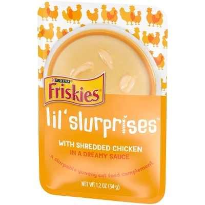- A slurpable, yummy cat food complement made with real chicken. Perfect 1.2-ounce size for an in-between meal treat