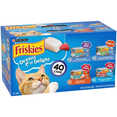 - Purina Friskies wet cat food variety pack contains 40 cans in four delicious flavors