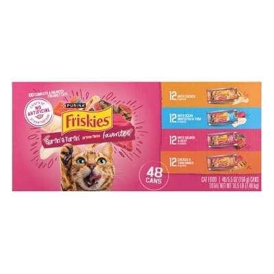 Entice your cat at every mealtime with the delicious and 100 percent complete and balanced nutrition for adult cats in every serving of Purina Friskies Surfin’ and Turfin’ Prime Filets Favorites canned cat food variety pack. This adult cat food includes chicken, ocean whitefish and tuna, salmon and beef, and chicken and tuna for delicious mealtime enjoyment and is packaged in recyclable cans. Serve your cat a delicious meal with a delicious wet cat food gravy and no artificial colors or preservatives with Purina Friskies Surfin’ and Turfin’ Prime Filets Favorites canned cat food variety pack.