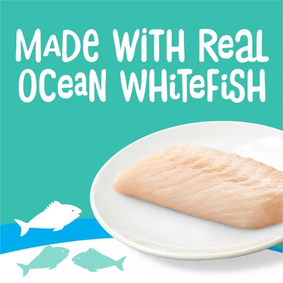 Wow your cat at snack time or mealtime with Purina Friskies lil’ Lickables Cat Treats With Ocean Whitefish. Made for snack time or to be added to her favorite kibble, these soft cat treats are lickable and easy to serve. They have a divine creamy puree texture and come in convenient hand-held tubes with a tear-open top—simply tear and squeeze and she’ll enjoy the tasty puree, while you enjoy a bonding moment with your favorite feline. Made with real seafood, each tube measures 0.5 ounces—the perfect size for a delicious snack or to add a little extra flavor to any dry or wet food.