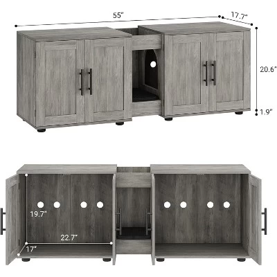 - 🐈Double-room cat litter cabinet design: Our spacious and luxurious two-room cat litter cabinet provides ample space for two cats to comfortably use at the same time. With dimensions of 55”L x 17.7”W x 22.5”L, it can easily accommodate most cat litter boxes, ensuring a convenient and stylish solution for your cat companions.