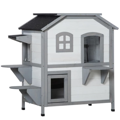 Gulches SkyLoft outdoor cat house stands 36 inches tall spans 31 inches wide and extends 22 inches deep finished in bright white for a clean look in any yard patio or garage The two story fir wood structure is topped with a slanted asphalt roof that sheds rain and snow while providing shade in summer and warmth in winter The upper loft gives cats a private perch while the lower level offers a cozy retreat multiple jumping platforms connect the levels for daily exercise A locking arm opens the hinged roof for quick cleaning and inspection and pre drilled holes make assembly simple Several entry and exit openings let cats move freely and provide escape routes from predators The roomy interior comfortably houses one or two cats under 10 pounds This package includes all panels hardware asphalt roof assembly guide and safety latch