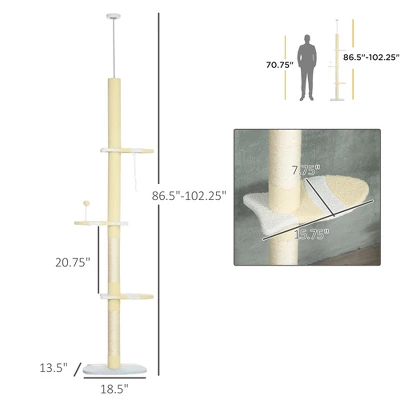 - Floor-to-Ceiling: This tall cat tree ranges from 86.5″ to 102.25″ high. When the tension rod is properly compressed, it remains strong and stable. Cats can safely jump, relax, and climb on multiple perches.
