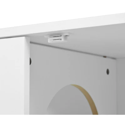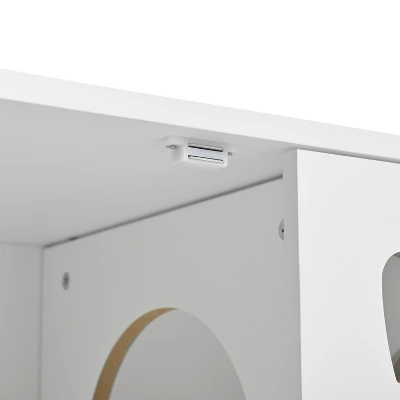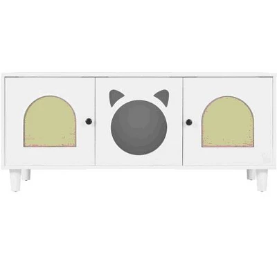 Elevate your home decor with the Gulches Cream White Cat Cabinet, a stylish and functional solution for pet owners. This modern 3-in-1 design serves as a litter box enclosure, a cozy cat shelter, and a chic storage piece. Featuring a cat pattern, side hooks for extra storage, and a magnetic door with a sisal scratching board, it caters to your cat’s needs while enhancing your living space. Crafted from high-quality materials with sturdy solid wood legs, this cabinet ensures long-term durability and safety for both pets and people.