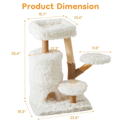 - Natural Wood & Eco-Friendly Materials — Built for Safety and Style:Crafted from smoothly polished natural wood and P2-grade particle board, this multi-level cat tree offers exceptional structural stability without any harsh odors. Covered in soft white long plush, it adds a cozy, elegant vibe to your home while ensuring a safe cat tree for daily use. Its minimalist design fits seamlessly into any interior, providing your indoor cats with a stylish and secure play space.