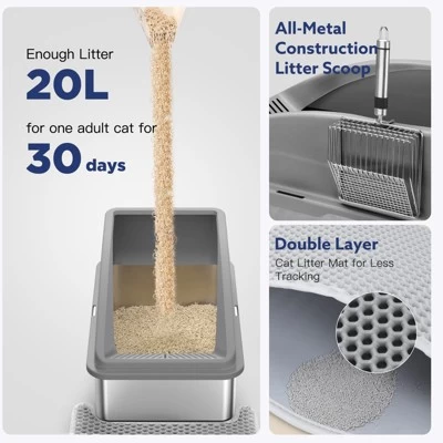 - ✅【Perfect Accessories For Cat 】 The Stainless steel litter box comes with a double-layer cat litter mat, which provides a comfortable surface for your cats to step on. It also includes an all-metal construction litter scoop, making it easy to clean the litter box thoroughly.