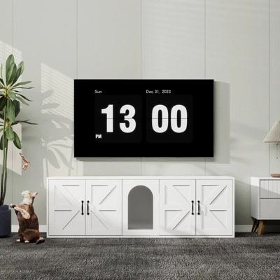 The white litter box is fashionable in design and suitable for various decoration styles.It can be used not only as a cat house but also as a cat toilet, giving cats the greatest privacy space.Close the door to block cat litter, and open the door to facilitate cleaning of the litter box enclosure. At the same time, you can also use this furniture as a TV cabinet, coffee table, etc., and place accessories on it to decorate your house. 2 spacious cabinets hold litter boxes or cat beds for 2 cats, or both for one cat: one side for a litter box, the other for a cat bed, Roomy interiors fit most cats and placing most cat litter boxes. The litter box cabinet adopts 3 grille air convection design, which can control indoor odor and keep the inside of the litter cabinet fresh and breathable, enhancing lighting. It’s made of E1 MDF with UV painting surface, After three painting processes, ensure the perfect appearance of the coating on the product surface.UV painting is more environmental than traditional NC painting, Carbon dioxide emissions are very close to zero. Waterproof surface coating is environmental and non-toxic, please feel free to use. Equipped with anti-tip design which firmly fixes the cabinet to the wall, ensuring the stability of the cabinet and protect your family’s safety. Including assembly manual and all necessary hardware and fasteners. Components are pre drilled and pre cut for assembly.